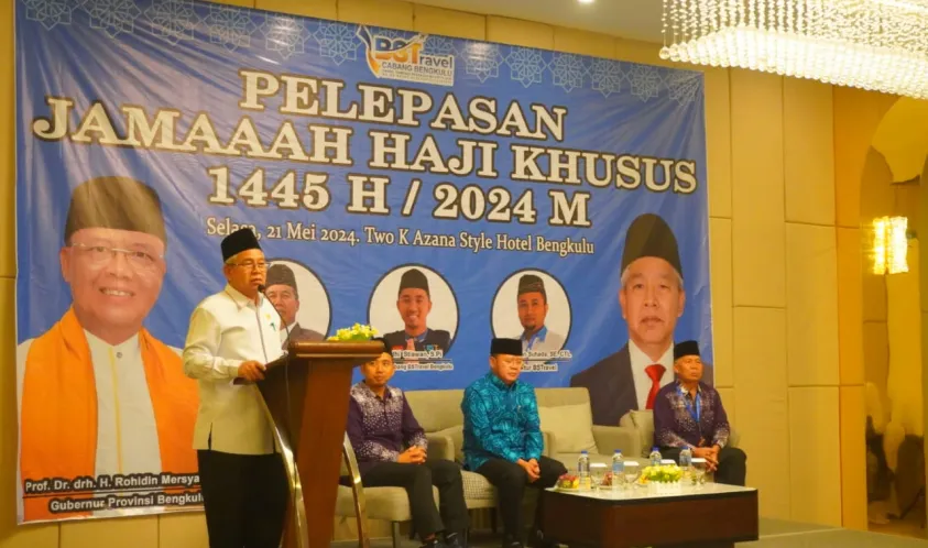 Alankanews.com,Bengkulu-- Gubernur Rohidin Mersyah secara resmi melepas 46 Calon Jamaah Haji (CJH) yang diberangkatkan dari PT Bahana Sukses Sejahtera (BSS) Travel Cabang Bengkulu di Hotel Two Azanah, Selasa (21/05).