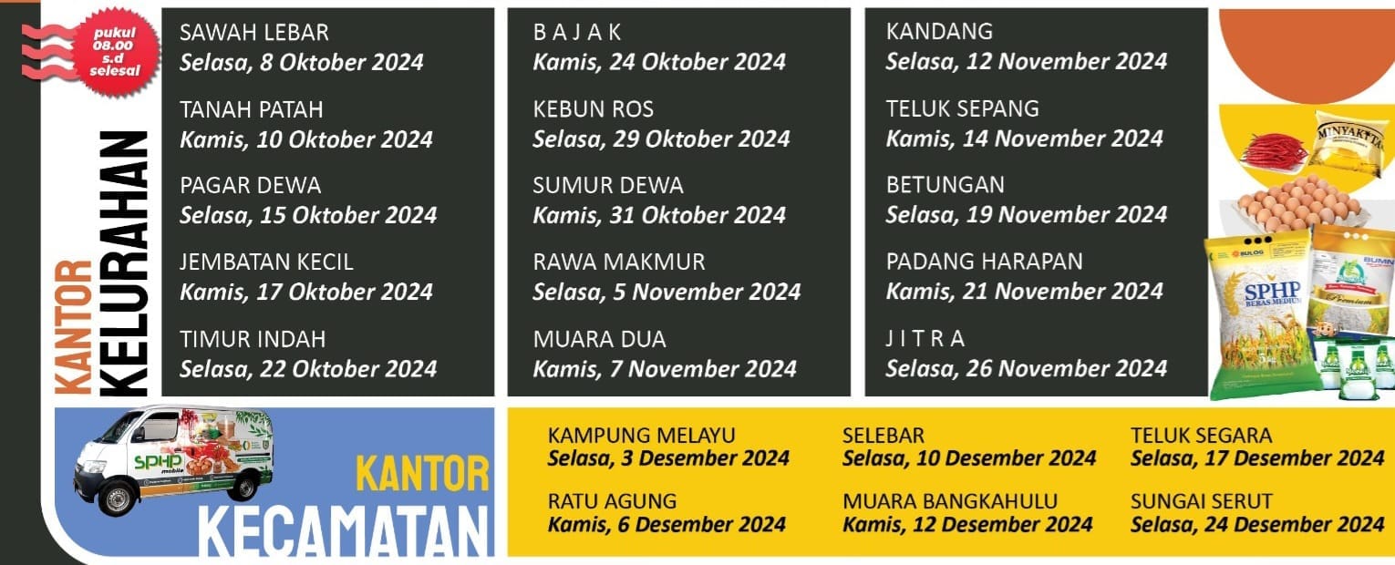 "Untuk jadwal terbarunya sudah ada dari bulan Oktober hingga akhir tahun. Dalam waktu dekat, 22 Oktober GPM digelar di kelurahan Timur Indah, 24 Oktober di kelurahan Bajak, 29 Oktober di Kebun Ros dan penutupan pada bulan ini yakni di kelurahan Sumur Dewa," jelas Kabag Ekonomi Setda Kota Bengkulu Dadi Hartono, Kamis (17/10/2024).