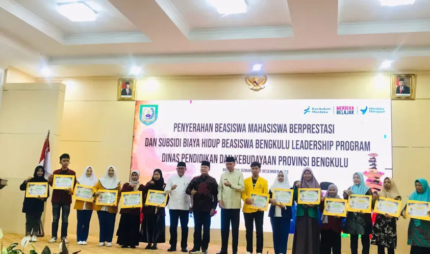 Alankanews.com, Bengkulu— Gubernur Bengkulu Prof. H. Rohidin Mersyah, M.M.A., menyerahkan Beasiswa Mahasiswa Berprestasi Dinas Pendidikan & Kebudayan Provinsi Bengkulu Tahun 2023 di Gedung Daerah Balai Raya Semarak Bengkulu, Jumat (22/12).