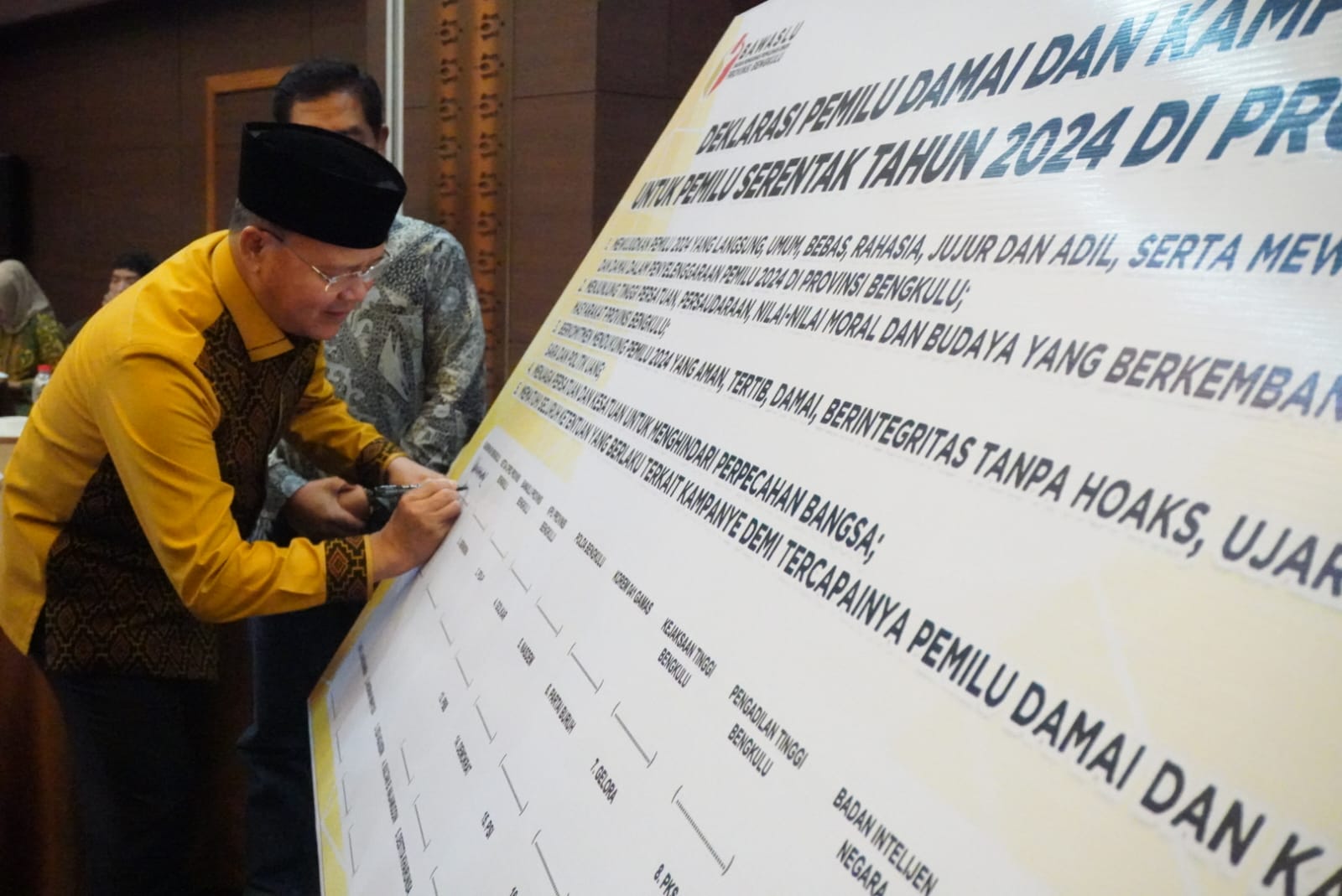 Penandatanganan atau Pernyataan sikap Deklarasi Pemilu Damai dan Kampanye Tertib Pemilu Serentak 2024 di Provinsi Bengkulu oleh Gubernur Bengkulu, Kamis (2/11)/ (Foto:Beta)