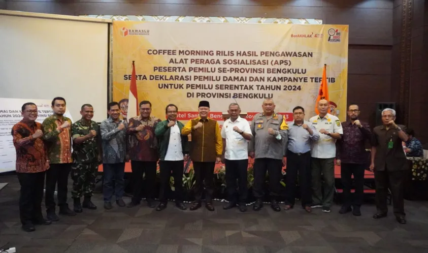 Alankanews.com, Bengkulu-- Gubernur Bengkulu Rohidin Mersyah menghadiri Coffee Morning terkait Rilis Hasil Pengawasan Alat Peraga Sosialisasi (APS) Peserta Pemilu se-Provinsi Bengkulu serta Deklarasi Pemilu Damai dan Kampanye Tertib untuk Pemilu Serentak Tahun 2024, di ballroom salah satu hotel di kawasan Sawah Lebar Kota Bengkulu, Kamis (02/11).