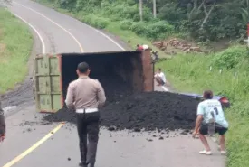 Truk Batu Bara Terguling di Tanjakan Rawan Laka Tunggal Rejang Lebong
