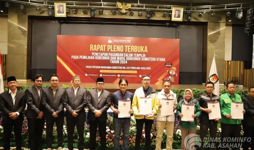 Alankanews.com, Asahan -- Komisi Pemilihan Umum (KPU) Provinsi Sumatera Utara (Sumut) menetapkan pasangan nomor urut 1 Bobby Afif Nasution – Surya sebagai Pasangan calon (Paslon) terpilih Gubernur dan Wakil Gubernur Sumut Periode 2025 -2030. Penetapan tersebut setelah KPU Sumut menggelar Rapat Pleno Terbuka Penetapan Pasangan calon (Paslon) terpilih pada Pemilihan Gubernur dan Wakil Gubernur Sumut tahun 2024 yang digelar di Hotel Mercure Jalan Perintis Kemerdekaan, Kota Medan, Provinsi Sumut, Rabu (05/02/2025).
