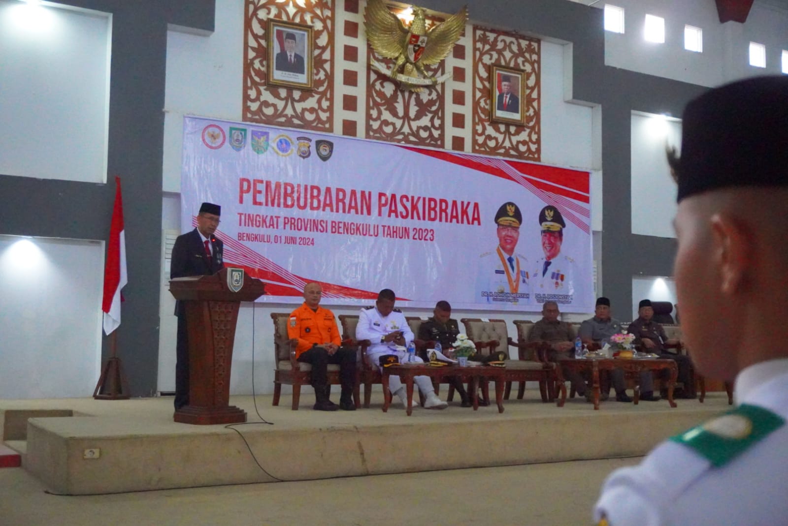 Sekda Provinsi Bengkulu Isnan Fajri secara resmi membubarkan 54 anggota Pasukan Pengibar Bendera Pusaka (Paskibraka) tingkat Provinsi Bengkulu tahun tugas 2023, Sabtu (01/06)/(Foto:Rilis Mc)