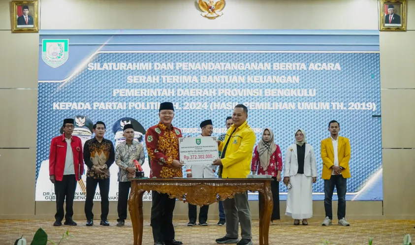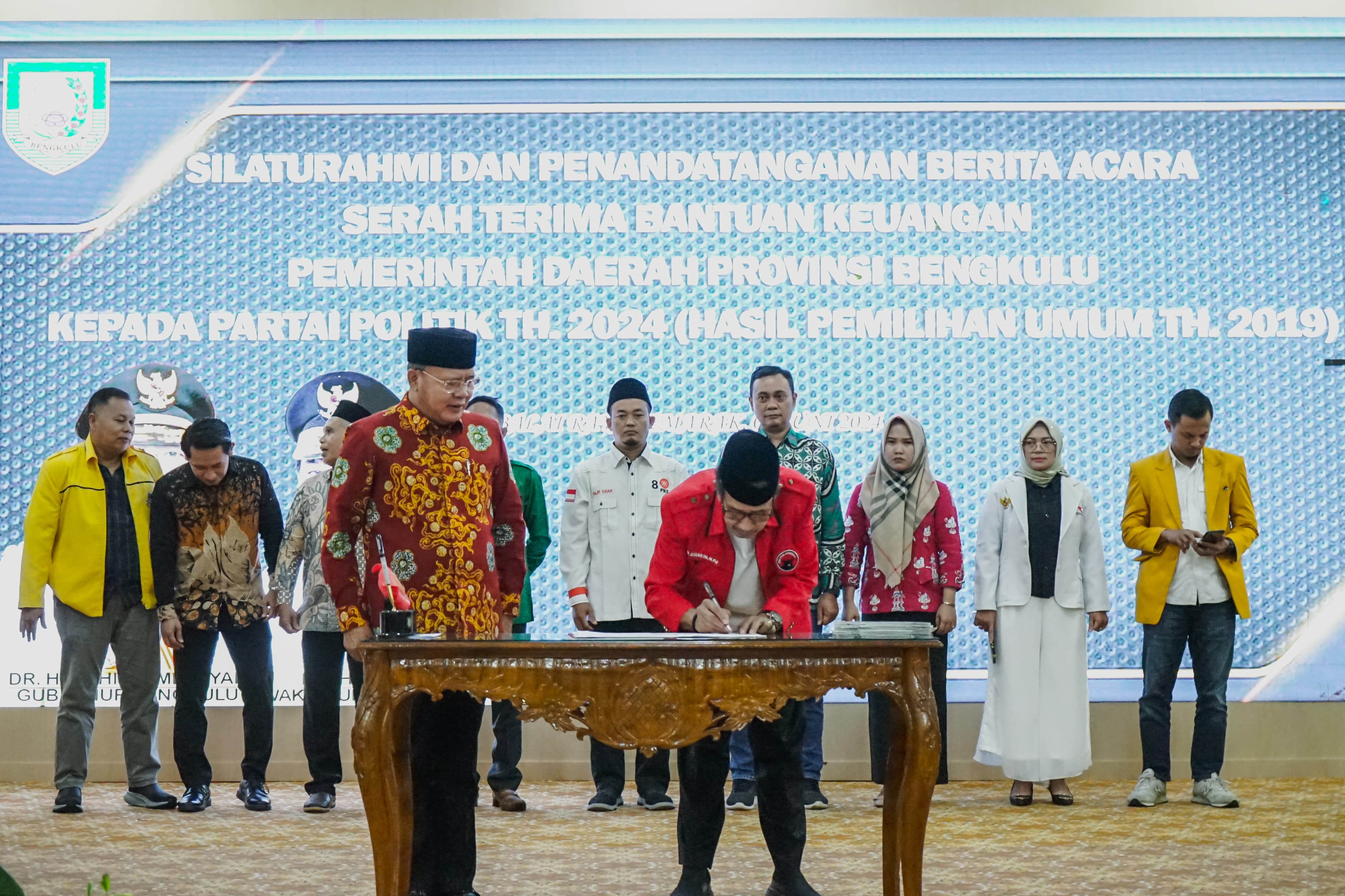 Gubernur Bengkulu Rohidin Mersyah menyerahkan bantuan partai politik (Banpol) tahap pertama tahun 2024 kepada 11 Pengurus Daerah Partai Politik (Parpol) pemenang pemilu 2019-2024, Rabu (05/06)/(Foto:Aisyah)