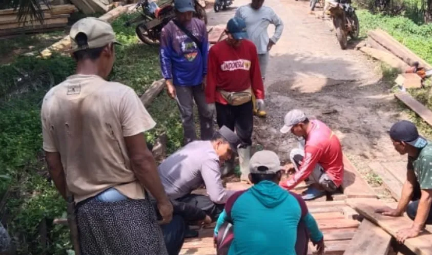 Alankanews.com,Kaur-- Personel Polsek Maje Polres Kaur Polda Bengkulu Bripka Zainal A (Bhabinkamtibmas) Brigpol Gulto melaksanakan kegiatan gotong royong untuk memperbaiki jembatan di Desa Sinarmulya, Kecamatan Maje, Kabupaten Kaur pada kamis (24/10/2024).