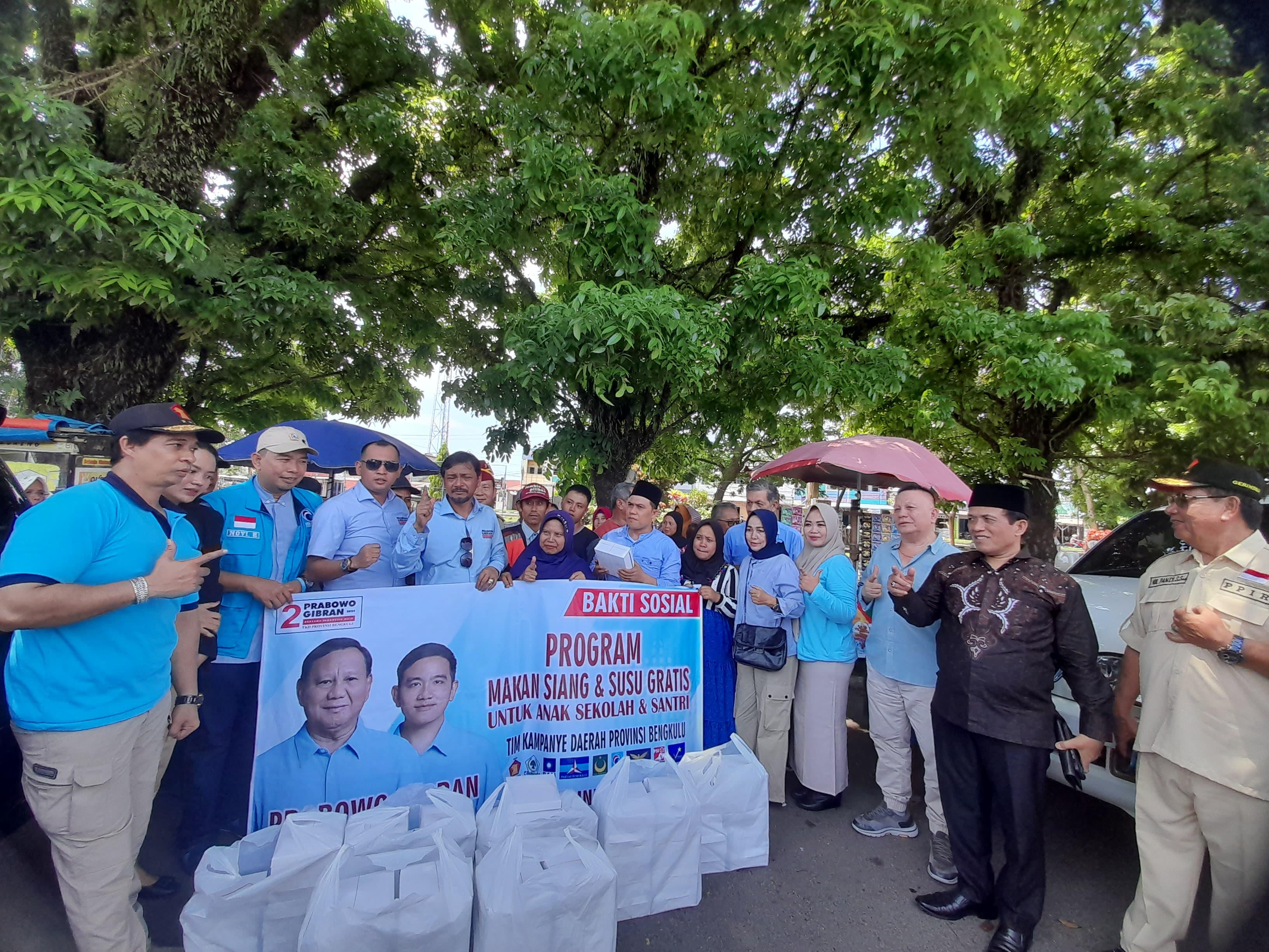 Suharto bersama Partai Koalisi dan Sekretaris BKD Provinsi Bengkulu bagi-bagi nasi kotak di Simpang Kandis, Rabu (29/11)/ (Foto: Annisa)