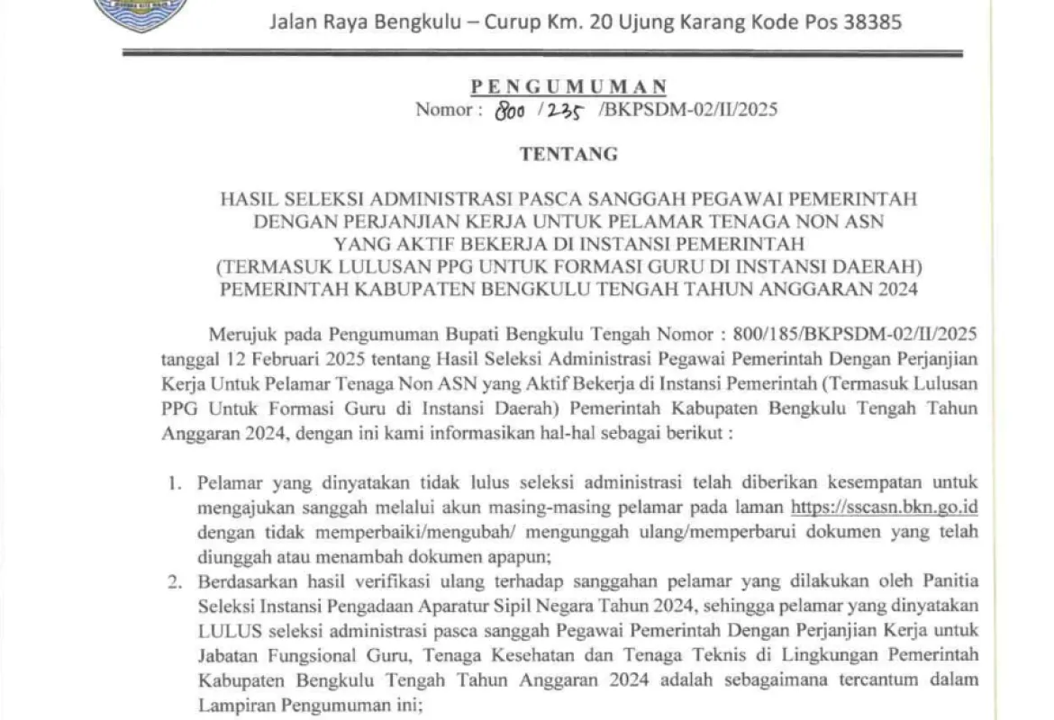 Pemkab Bengkulu Tengah Umumkan 1.032 Pelamar Lulus Seleksi Administrasi PPPK Tahap II Pasca Sanggah