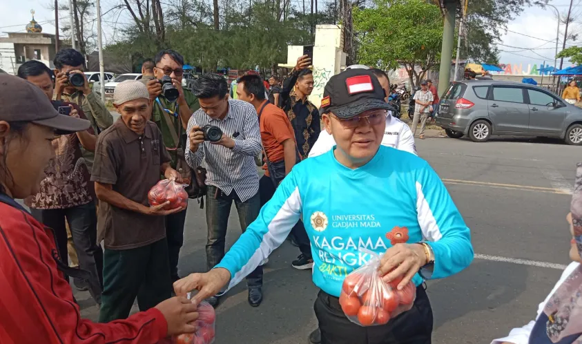 "Saat ini harga tomat sedang anjlok, sehingga beberapa petani tidak mau memanennya. Oleh karena itu, KAGAMA turun langsung untuk membeli hasil tani mereka, yang kemudian dibagikan secara gratis kepada masyarakat Bengkulu," ujar Rohidin yang juga merupakan Ketua KAGAMA Provinsi Bengkulu.
