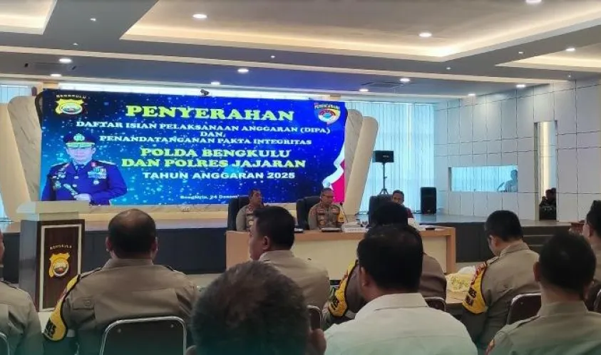 Alankanews.com,Kota Bengkulu--Kapolres Rejang Lebong, AKBP Eko Budiman, S.I.K., M.I.K., M.Si., menghadiri kegiatan penyerapan Daftar Isian Pelaksanaan Anggaran (DIPA) dan penandatanganan pakta integritas yang diselenggarakan di Aula Awaloedin Djamin Mapolda Bengkulu. Acara ini dipimpin langsung oleh Kapolda Bengkulu, Irjen Pol Anwar, S.I.K., M.Si., dan diikuti oleh seluruh pejabat utama Polda Bengkulu, serta para Kapolres dan Kapolresta jajaran, Rabu (25/12/2024).