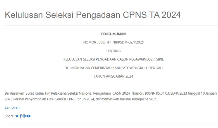 Alankanews.com, Bengkulu Tengah -- Pemerintah Kabupaten (Pemkab) Bengkulu Tengah melalui Badan Kepegawaian dan Pengembangan Sumber Daya Manusia (BKPSDM) resmi mengumumkan hasil seleksi Calon Pegawai Negeri Sipil (CPNS) setelah masa sanggah pada Kamis, 23 Januari 2025.