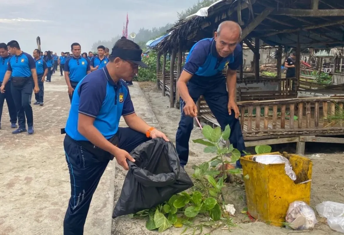 Peringati HUT Bhayangkara ke-79, Polda Bengkulu Gelar Aksi Bersih-Bersih Pantai Panjang